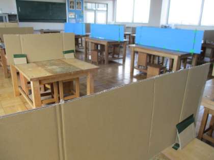 そこで、感染対策の一環として手製のパーティションを設置しながら学習を進めています。