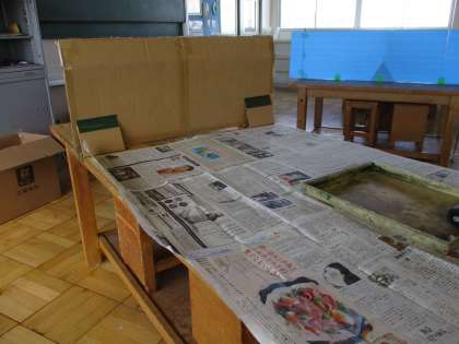 版画は道具の関係で、図工室で学習を進めたいのですが、机の数と子供の人数の関係で、1つの机に複数の子供が座らなければなりません。