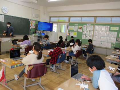 一年生の生活科では、「風で動くおもちゃをつくろう」で各自がタブレットの画像を見ながら、楽しく一生懸命おもちゃを作っていました。
