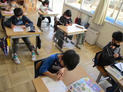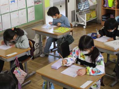 朝自習の時間の1年生。みんな集中してプリント学習に取り組んでいます。