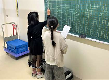 朝の会後、健康観察を終え、出欠を職員室前黒板に記入に来ている仲間たちです。当番活動がしっかり機能していますね。