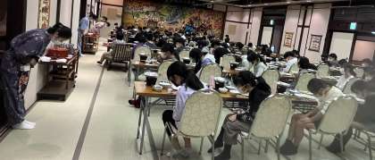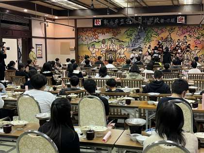 修学旅行 夕食6 公開日 2022/11/21 更新日 2022/11/21 6年生 食事係の仲間が音頭をとって、宿の担当の方へのお礼とご馳走様をしました。これからお風呂、お土産購入タイム、自由時間になります。