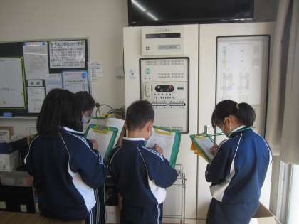 3年生が学校の消防施設について調べていました。火災報知器や防火扉、煙探知機を確認していました。職員室の火災受信機も見にきました。