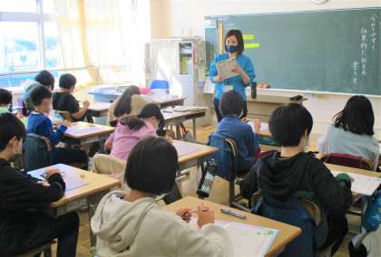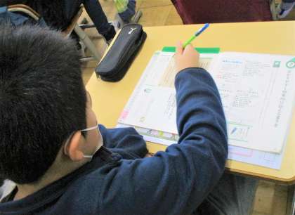 5年生の国語(硬筆)の授業です。今日は、「わかりやすく効果的に相手に伝える書き方」について学んでいます。みんな集中して教科書を見ながら学んでいます。