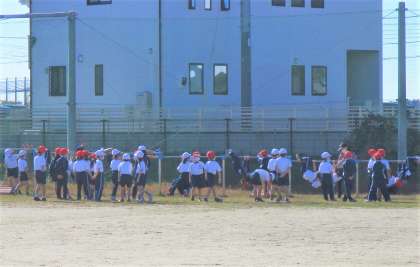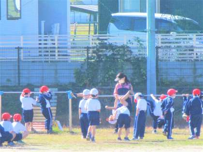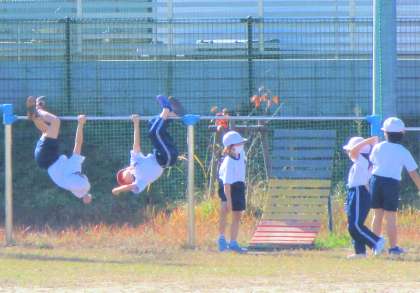 1年生の学年合同体育の授業です。今日は、「器械・器具を使っての運動遊び」領域の「鉄棒を使った運動遊び」を行っています。なかなか逆さになったり、回ったりする経験は普段の生活ではありません。遊びながらそのよう経験をして、器械運動につないでいきます。みんな楽しみながら運動をしています。