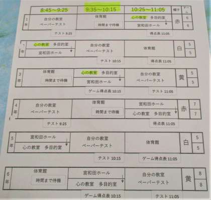 ふれあい祭り、始まりました 公開日 2022/11/26 更新日 2022/11/26 学校 8:45〜予定通り触れ足祭りが始まりました。体育館、心の教室、多目的室、宮和田ホール、教室でのペーパーテストと密を避けながらの楽しい内容です。