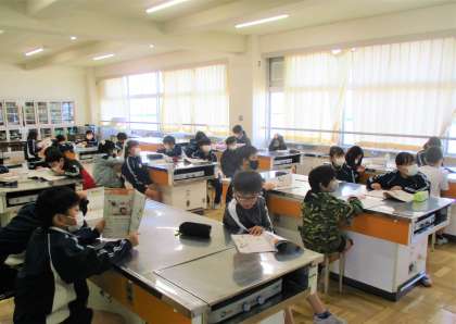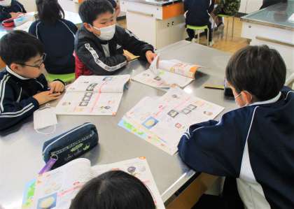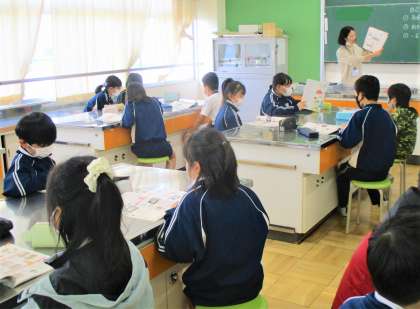 5年生の家庭科の授業です。家庭科は5年生から学びます。今日は初めての家庭科の授業です。ちなみにこの授業もチーム指導です。今日は、1年間どのような学びがあるかの見通しをもつためのガイダンスの時間です。調理実習もありますね。