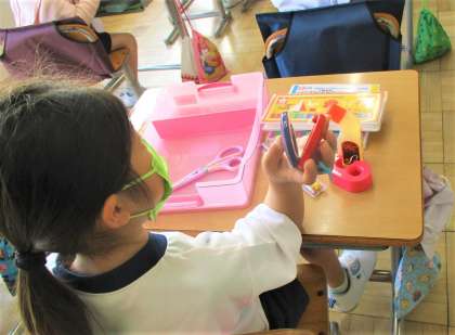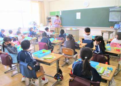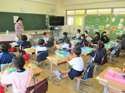 1年生の学級活動の授業です。今日は、机の中に入れておくお道具箱の中を確認し、使い方を学んでいます。みんな行儀よく先生のお話を聴いています。素晴らしいです!