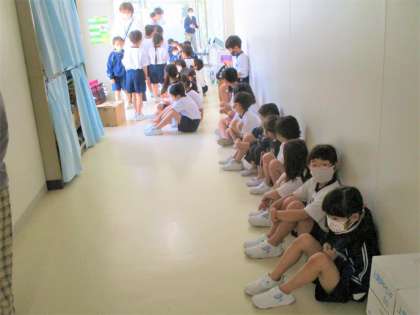 1年生の身体測定を廊下で待っている姿です。静かに、行儀よく座って待っています。先生のお話をよく聴いて実践できています。素晴らしいです!