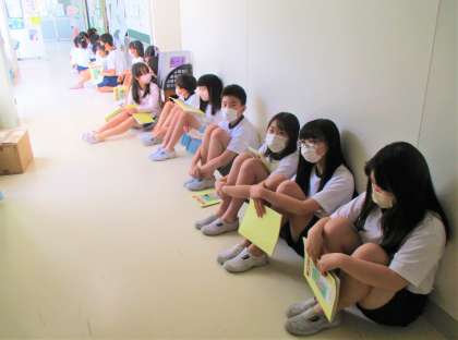 今日は、5・6年生が身体測定です。5年生、廊下で静かに座って待っています。素晴らしい!