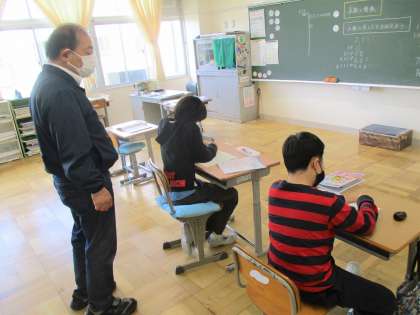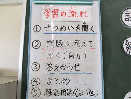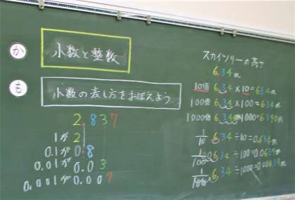 のびやか学級の算数の授業です。今日は、少数の表し方について学んでいます。集中しています!黒板の左側には、学習の見通しが掲示してあります。これもユニバーサルデザインの考え方を生かした授業です。