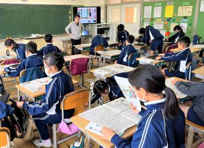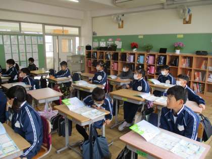 4年生の国語の授業(毛筆)です。今日は、これから始まる毛筆や硬筆の授業についてのガイダンスを行っています。準備の仕方もしっかり実践しています。