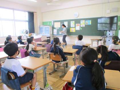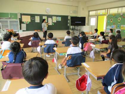 1年生の朝の会のようです。先生のお話を姿勢正しく聴いています。素晴らしいですね!