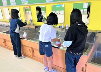 保健委員会の仲間たちが、業間休み時間に手洗い場の液体せっけんの補充をしてくれています。ありがとう!
