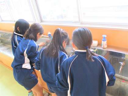 5年生が手洗い場で、水槽の掃除をしてくれています。頑張ってます!