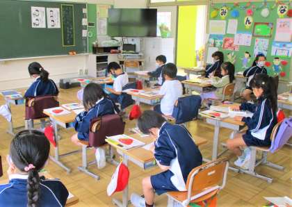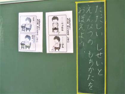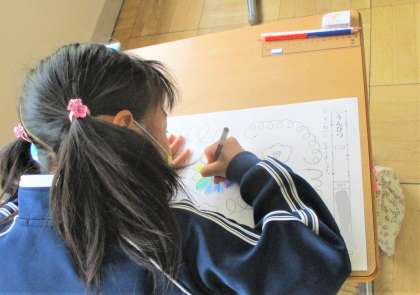 1年生の国語の授業です。今日は、正しいし姿勢とえんぴつのもちかたについて学んでいます。プリントに正しく学んだえんぴつのもちかたで、線をなぞったり、色を付けたりしています。みんな一生懸命、集中して取り組んでいます。素晴らしい!