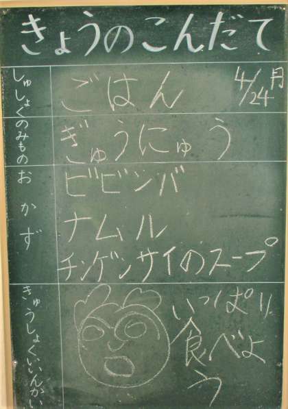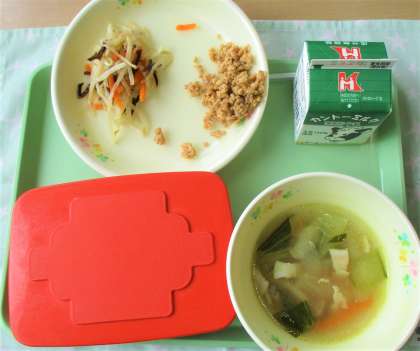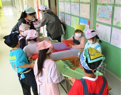 2年生の給食準備・配膳の様子です。当番さんがいち早く着替えて準備・配膳をしてくれています。お兄さん、お姉さんになっていますね。1年生のグッドモデルです。