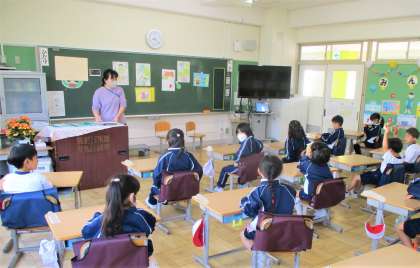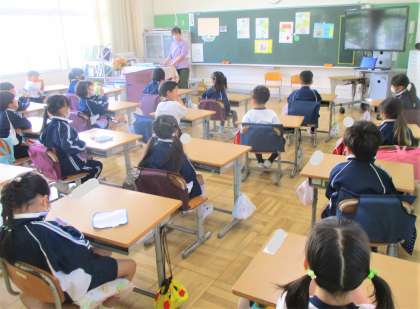 朝の会1 公開日 2023/04/25 更新日 2023/04/25 学校 1年生の朝の会の様子です。健康観察をしています。名前を呼ばれると、「はい、元気です」と元気よく返事をするとと同時に、ハンカチとティッシュを両手で持って先生に見せています。