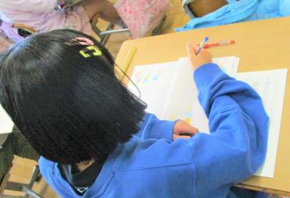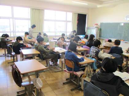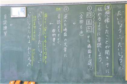 5年生の国語の授業です。「だいじょうぶだいじょうぶ」という物語を読んでいます。今日は、自分が想像したことを聞き手がわかるような音読の仕方を考え、練習します。みんな集中して取り組んでいます。