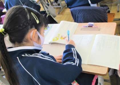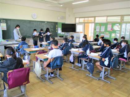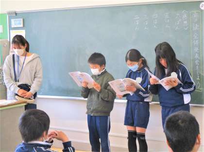 4年生の国語の授業です。「こわれた千の楽器」を読んでいます。今日は、グループごとに情景に思いを込めて音読発表会をしています。聴いている仲間たちもしっかり評価しながら聴いています。