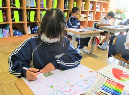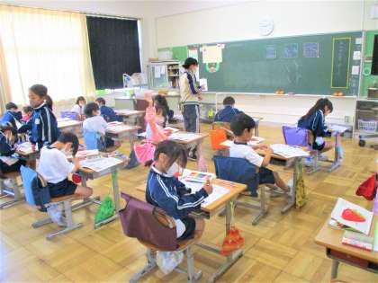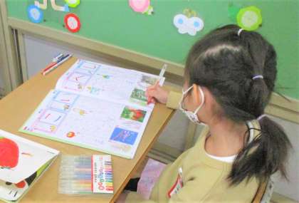 1年生の国語の授業です。今日は、ひらがなをなぞりながら丁寧に書いています。みんな一生懸命です。すばらしい!