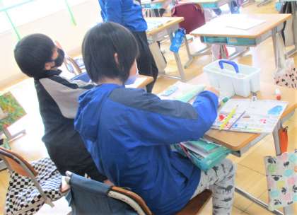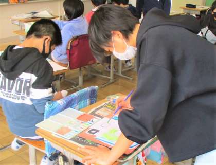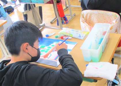 6年生の図画工作の授業です。「わたしのお気に入りの場所」を描いています。事前に学校の中で自分の好きな場所の写真を撮って、絵で表現しています。みんな丁寧に描いています。