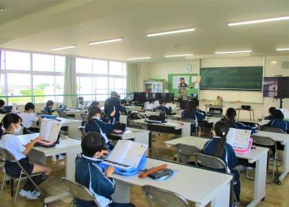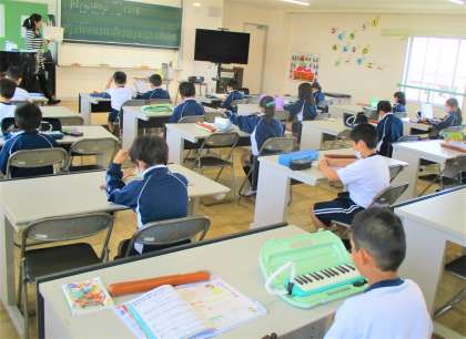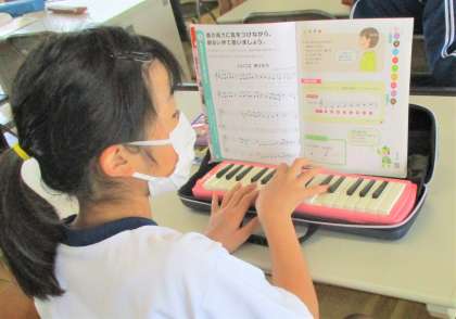 4年生の億額の授業です。音楽室です。今日は「いいことありそう」を歌ったり、鍵盤ハーモニカで演奏したりします。みんな集中して取り組んでいます。頑張れ!