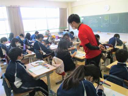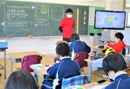 6年生の算数の授業です。図形の領域です。今日は、円の面積の求め方について考えています。みんな真剣ですね。いい雰囲気です。