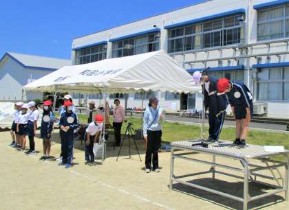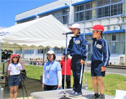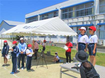 透き通るような青空のもと、1回目の全体練習が行われました。集合も早く、開始時間より早めに始めることができました。それぞれの役割をしっかり果たしていました。1回目とは思えたいくらい素晴らしい態度でした。暑さで熱中症も心配されましたが、途中で水分補給も入れて開会式・閉会式の練習すべてができました。素晴らしい集中力でした!