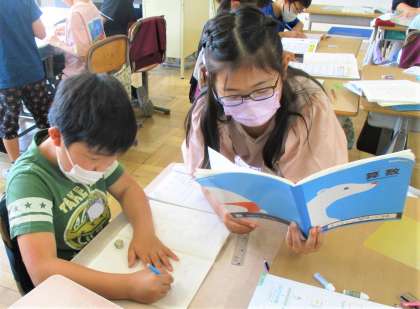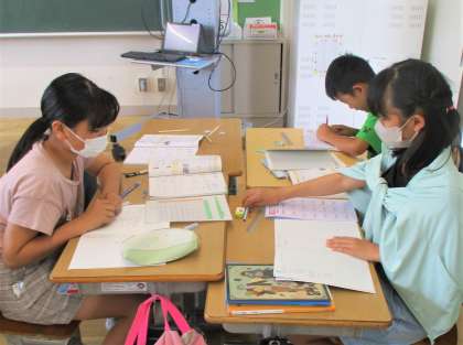 4年生の算数の授業です。今日は割り算の学びです。グループでどのようにしたら計算できるか、学び合っています。協働的な学びですね。