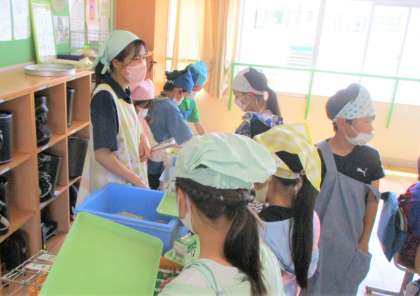 4年生の給食準備・配膳の様子です。当番の仲間たちが手際よく配膳しています。