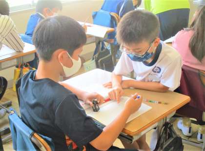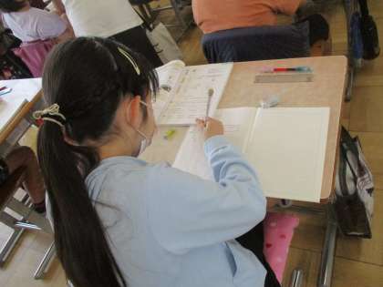4年生の算数の授業です。ちょうど、適用練習をしているところです。自分で問題を解いたり、学び合ったり、教え合ったりして問題に取り組んでいます。みんな頑張ってます!