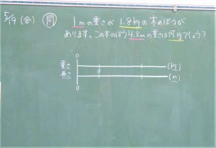 5年生の算数の授業です。割合についての学びです。問題を読んで数直線で変化の様子や度合いを確認しています。みんな集中しています。