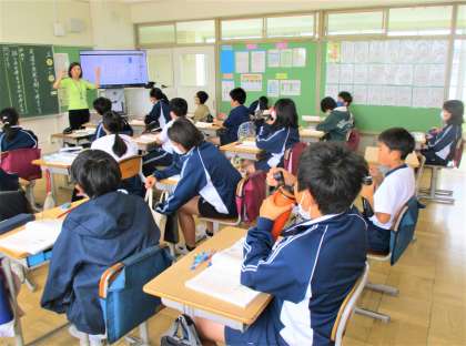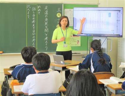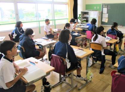 6年生の国語の授業です。「友達の意見を聞いて考えよう」の単元です。「聞くこと」「話すこと」の内容です。今年度、チーム宮和田では「しっかり聴いて正しく話す」ことにも重点を置いています。学びを実際の生活に生かすことが本当の勉強です。担任の先生の配慮で、暑い場合には水分を取ながら授業を受けてよいことにしています。