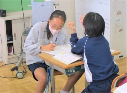 6年生の算数の授業です。図形の学びです。今日は、円の面積の求め方について学び合っています。みんな頑張って問題に向き合っています。