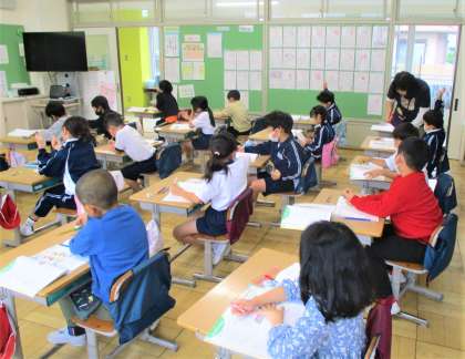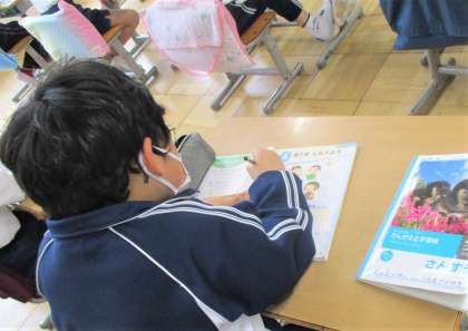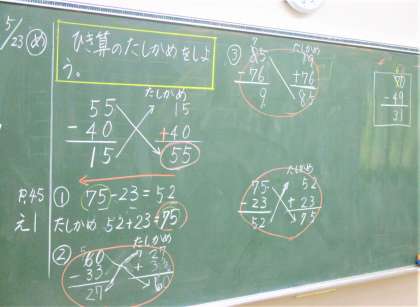 2年生の算数の授業です。今日は、ひっ算の確かめについて学んでいます。間違えのないように確認することは大事ですね。みんな一生懸命取り組んでいます。