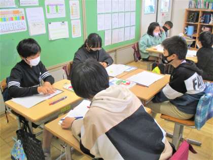 6年生の算数の授業です。今日は様々な形の面積を求めています。どのようにすれば求められるか、グループごとに協働して考えています。みんな頑張ってます!