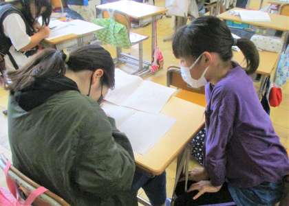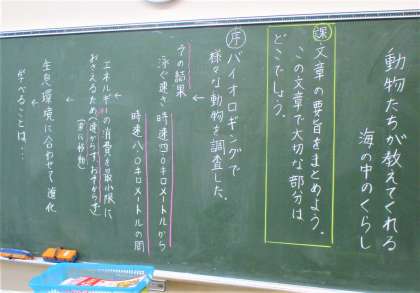 5年生の国語の授業です。「動物たちが教えてくれる海の中のくらし」を読んでいます。今日は、自分がとらえた説明文の要旨についてまとめています。自分で考えたり、仲間と協働したりしてまとめています。