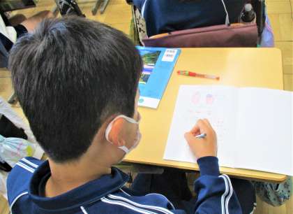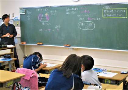 5年生の理科の授業です。「植物の発芽と成長」について学んでいます。今日は、種子のつくりを学び、その後種子と子葉には栄養素であるでんぷんが含まれているかどうかについて実験を通して学びます。みんな頑張れ!