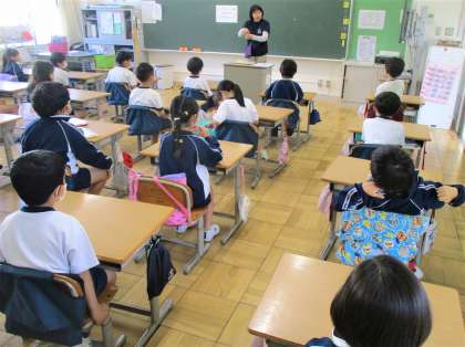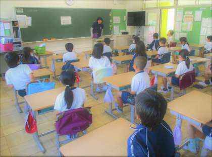 2年生の朝の会の様子です。先生のお話をみんな行儀よく聴いています。素晴らしい!