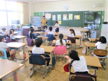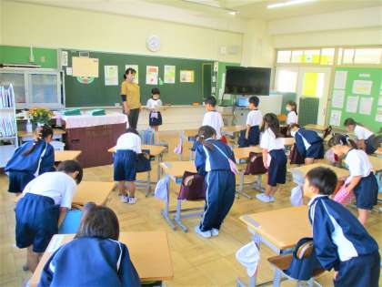 1年生の朝の会の様子です。日直の仲間が前に出てきて、朝のごあいさつをするところです。ごあいさつの時、しっかり礼もできています。「礼を正す」ことは大事なことです。