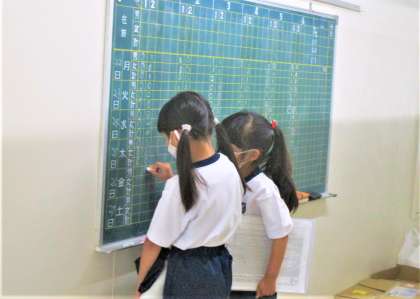 朝の会終了後、職員室前の出欠黒板に記入しに来てくれています。毎日忘れずにその責任を果たしています。