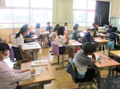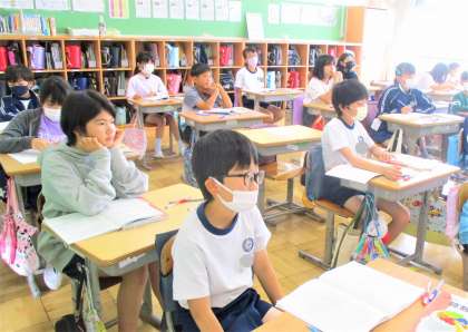 5年生の算数の授業です。今日は、少数と少数のかけ算がどのように計算すればよいか?が学習課題です。みんなどのようにしたら正しく計算できるか一生懸命考えています。頑張れ!