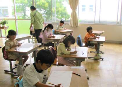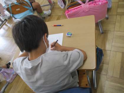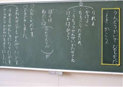 1年生の国語の授業です。今日は、運動会で楽しかったことを作文にまとめています。みんな運動会を思い出しながら一生懸命文章を書いています。