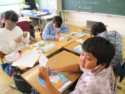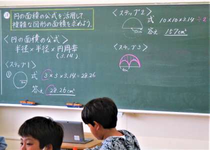 6年生の算数の授業です。今日は、学んだ円の面積の求め方を活用して、様々な形の面積鵜を求めています。プリントにある問題をハサミで切り取ったり、色を塗ったりする算数的活動を取れながら発展的な問題に取り組んでいます。頑張れ!