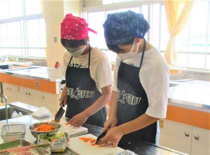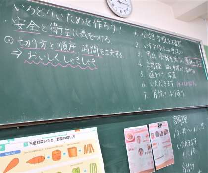 6年生の家庭科の授業です。今日は調理実習です。「いろどりやさいいため」を調理しています。常時に野菜を切り、調理を始めているグループもありました。みんな楽しみながらしっかり学んでいます。家庭でも実践してみましょう!