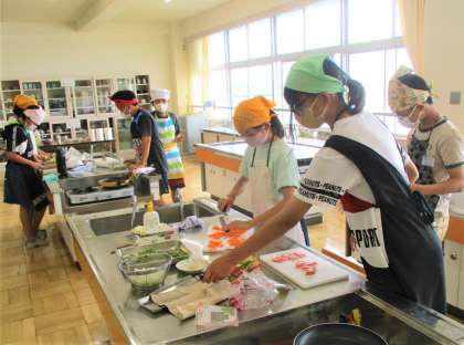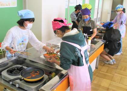 6年生の家庭科の授業です。今日は調理実習です。「いろどりやさいいため」を調理しています。常時に野菜を切り、調理を始めているグループもありました。みんな楽しみながらしっかり学んでいます。家庭でも実践してみましょう!