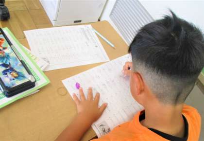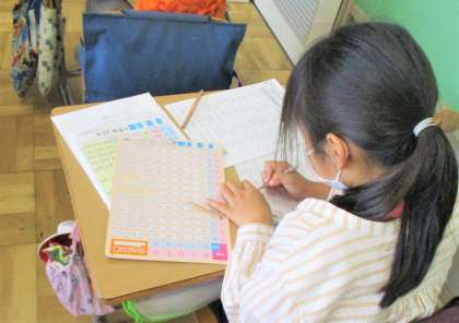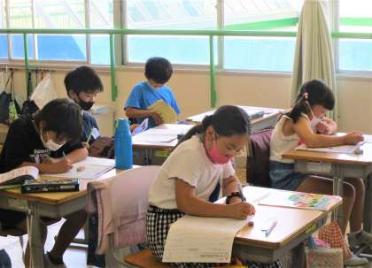3年生の国語の授業です。ローマ字を学んだあと、漢字練習に取り組んでいます。みんな一生懸命ドリルやプリントに取り組んでいます。頑張ってます!