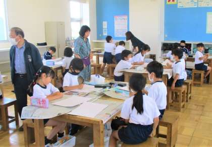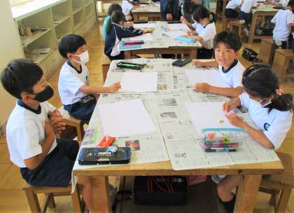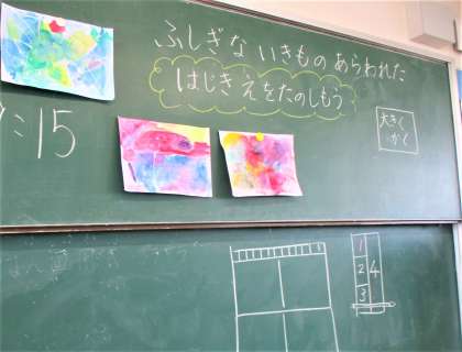 2年生の図画工作の授業です。1・2組合同で図工室です。「はじき絵をたのしもう」に取り組んでいます。画用紙に思い思いの絵を白いクレヨンで書きます。この後、絵具で着色して、白いクレヨンで書いた絵が浮かび上がってきます。どんな作品になるか楽しみですね。