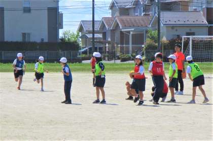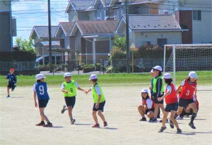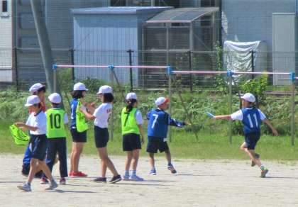 5年生の体育の授業です。陸上運動のリレーに取り組んでいます。各グループ、バトンの渡し方やコーナーの走り方を意識しながら一生懸命取り組んでいます。いい勝負です!